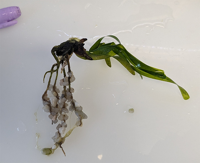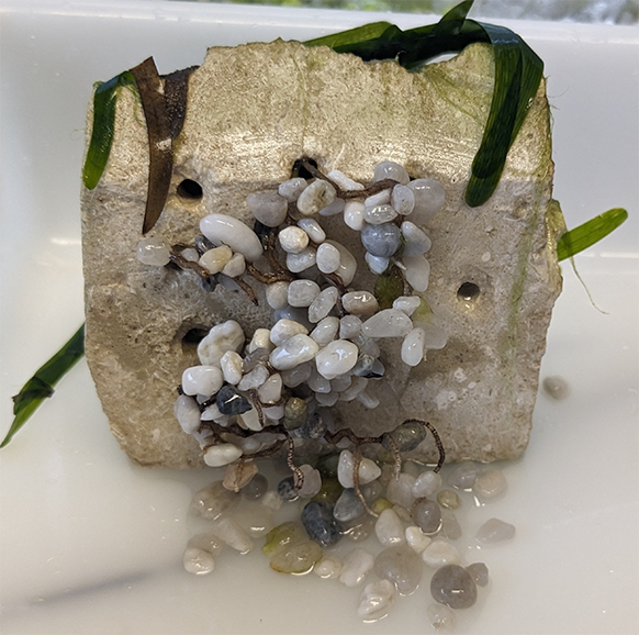 Les plàntules, un cop desenvolupades, mostren capacitat d’arrelament en diferents superfícies marines. Les seves arrels inicials són enganxoses i es poden adherir tant a còdols com a roques, creant una base estable per al seu creixement.